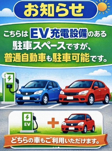 なお、電気自動車の専用区画ではありませんので、普通自動車もこれまで通り駐車して頂いてOKです👍